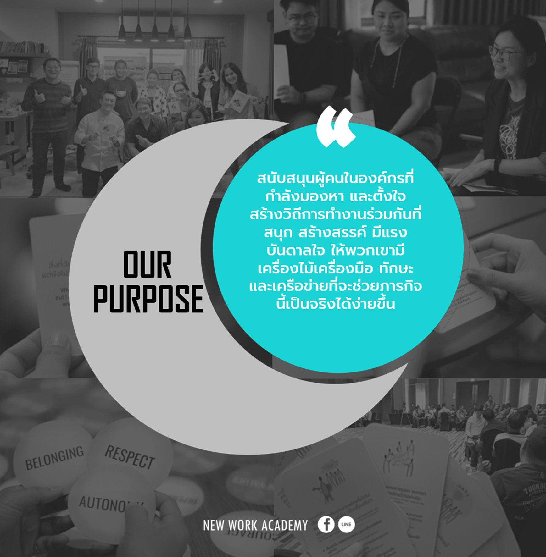สร้างเครื่องมือเพื่อสนับสนุนองค์กรสู่การทำงานร่วมกันในวิถีใหม่ ที่ให้ความสำคัญกับความร่วมไม้ร่วมมือ ความสร้างสรรค์ สุขภาวะ การจัดการตัวเอง และแรงบันดาลใจ รวมถึงจัดพื้นที่การเรียนรู้ที่เน้นการฝึกทักษะ สำหรับผู้นำกาเปลี่ยนแปลง เชื่อมโยงเครือข่ายคนทำงานที่มีหัวใจ และมีความฝันคล้ายคลึงกันเพื่อเสริมพลังให้กัน บนเส้นทางสู่วิถีการทำงานที่เติมเต็มยิ่งขึ้น เราคือใคร .... ?